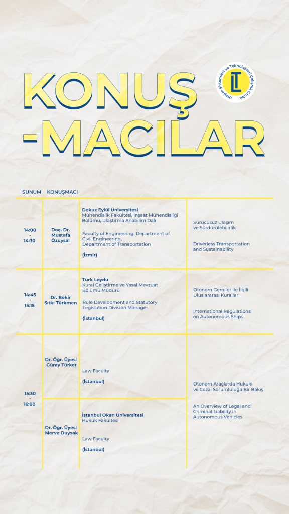 Doç. Dr. Mustafa Özuysal (Dokuz Eylül Üniversitesi İnşaat Mühendisliği Bölümü), ulaşım planlaması ve altyapı sistemleri üzerine konuşurken, Dr. Öğr. Üyesi Can Gökçe, Dr. Öğr. Üyesi Merve Duysak, ve Dr. Öğr. Üyesi Güray Türker (İstanbul Okan Üniversitesi), mühendislik ve hukuk disiplinleri çerçevesinde konunun teknik ve hukuki boyutlarını analiz etmiştir.
